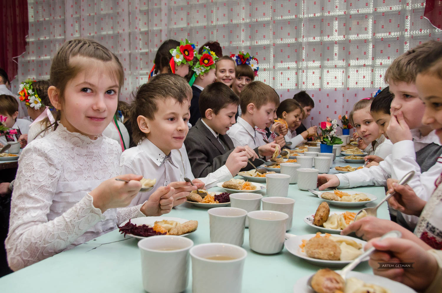 Поварами родной школы были приготовлены для своих учеников: украинский борщ с пампушками, вареники с картошкой и луком, котлета "Полтавская", узвар и другие блюда.